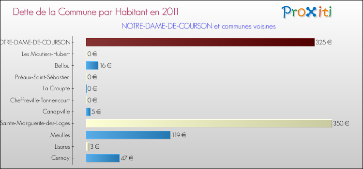 A Notre-Dame-de-Courson, la dette due par habitant de la commune en 2011 est donc moins élevée de 34.08 % que pour des communes similaires.