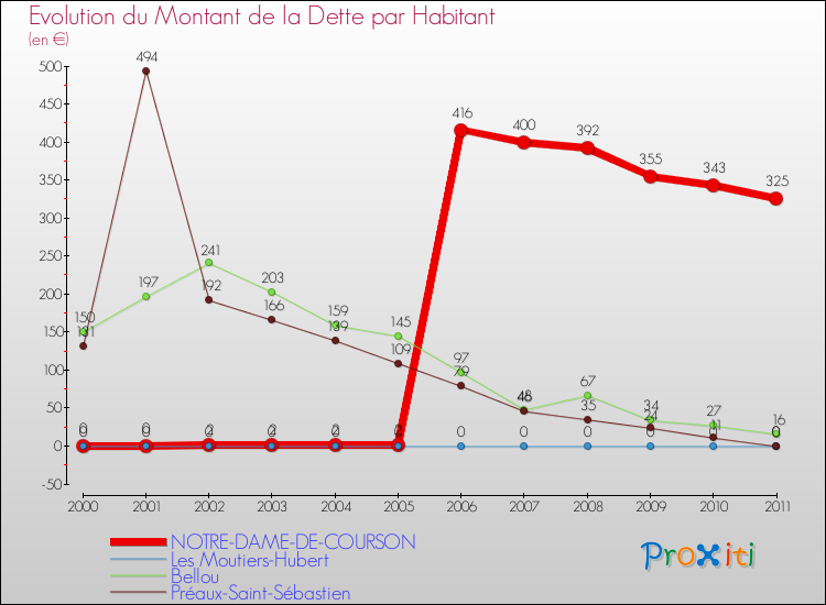 A noter : la valeur moyenne de la dette par habitant des communes françaises similaires à Notre-Dame-de-Courson était de 493 € par habitant, en 2011.