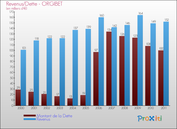 Comparaison Revenus/Dette de Orgibet (de 2000 à 2011)