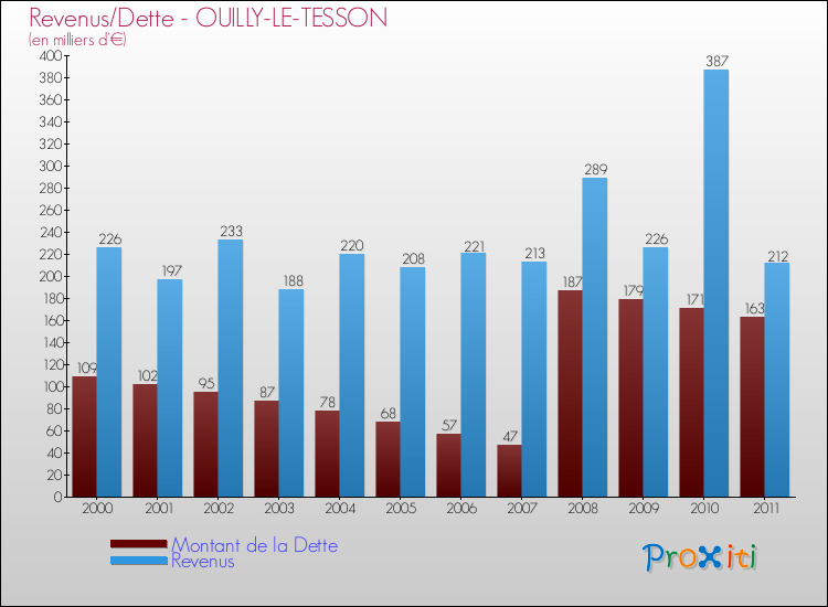 Comparaison Revenus/Dette de Ouilly-le-Tesson (de 2000 à 2011)