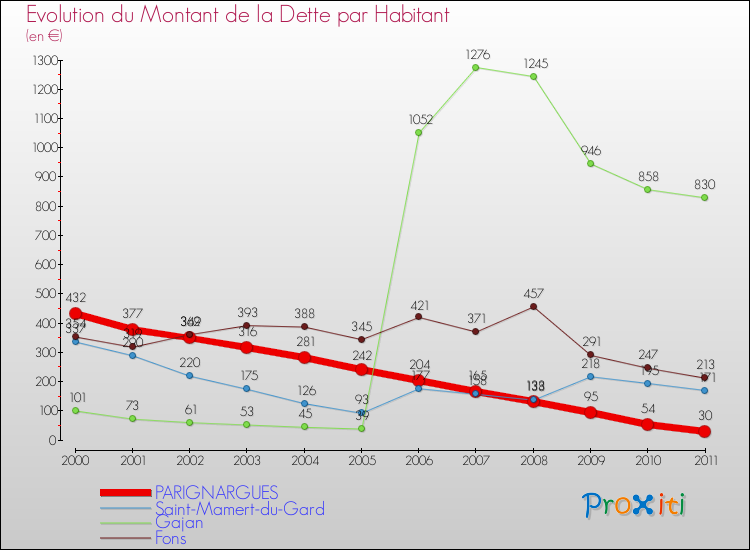 Par rapport aux 593 habitants de Parignargues, en 2011 le poids de cette dette représente 30 € par habitant.