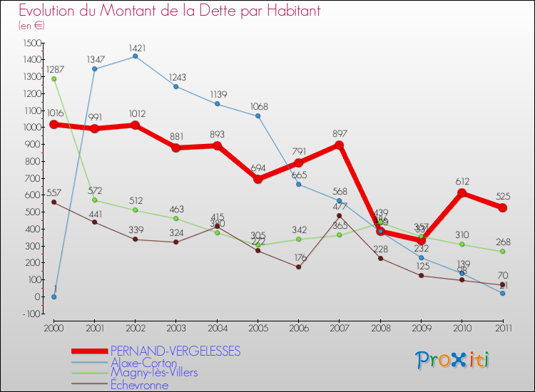 A Pernand-Vergelesses, la dette par habitant a donc baissé de 48.33 % entre 2000 et 2011.