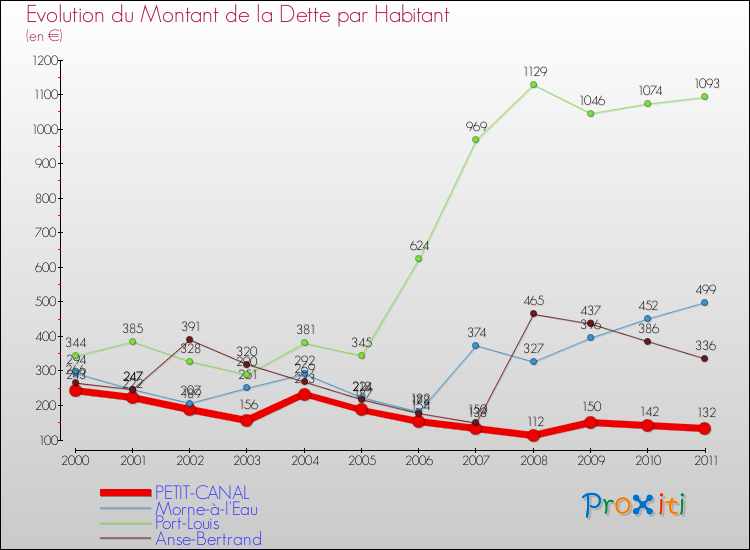 Par rapport aux 8 245 habitants de Petit-Canal, en 2011 le poids de cette dette représente 132 € par habitant.