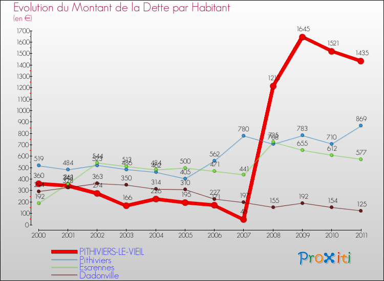Pendant la même période, les communes françaises similaires à Pithiviers-le-Vieil, ont vu leur dette par habitant augmenter de 17.3 % en moyenne entre 2000 et 2011.