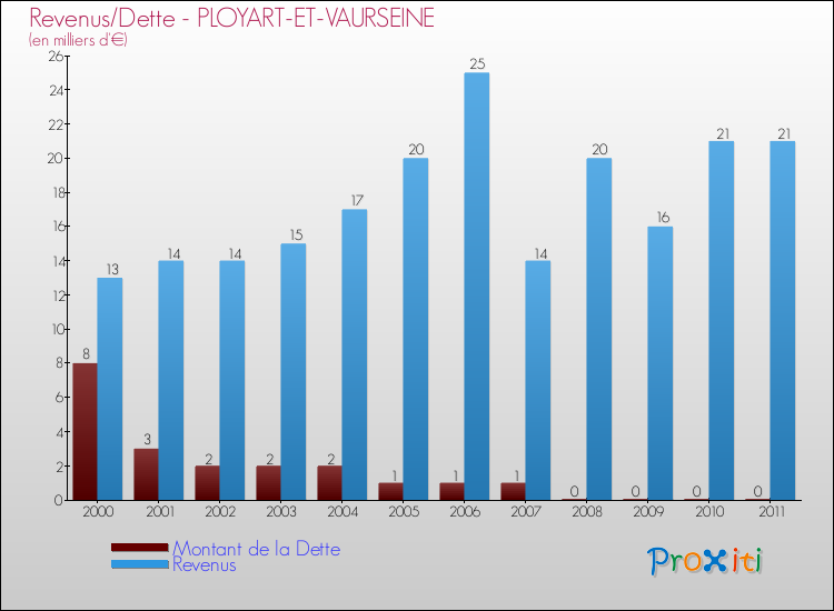 Comparaison Revenus/Dette de Ployart-et-Vaurseine (de 2000 à 2011)
