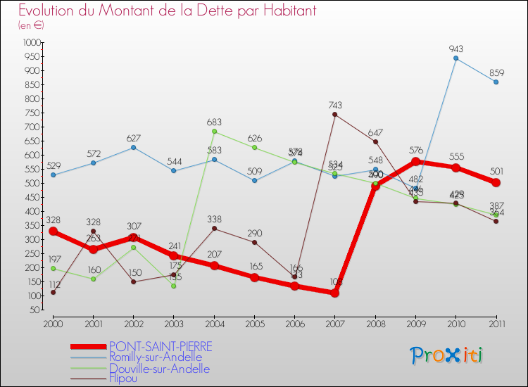 Pendant la même période, les communes françaises similaires à Pont-Saint-Pierre, ont vu leur dette par habitant augmenter de 24.32 % en moyenne entre 2000 et 2011.