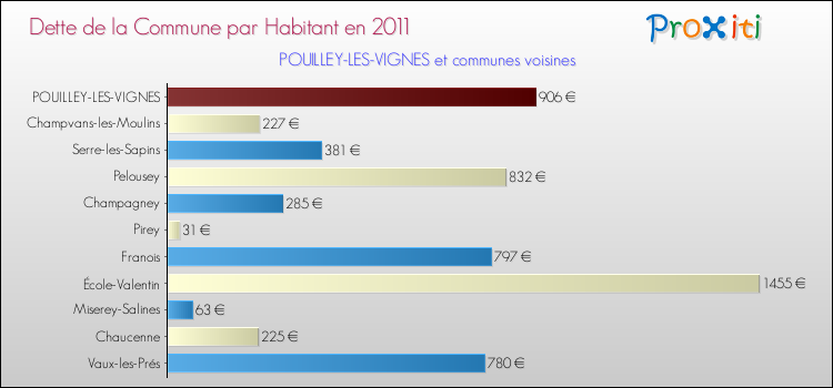 A Pouilley-les-Vignes, la dette due par habitant de la commune en 2011 est donc plus élevée de 53.04 % que pour des communes similaires.