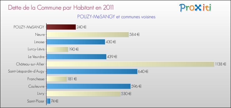 A Pouzy-Mésangy, la dette due par habitant de la commune en 2011 est donc moins élevée de 54.11 % que pour des communes similaires.