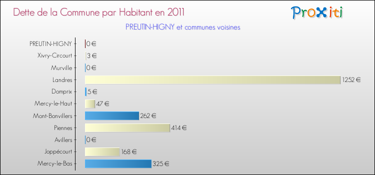 Par rapport aux 141 habitants de Preutin-Higny, en 2011 le poids de cette dette représente 0 € par habitant.