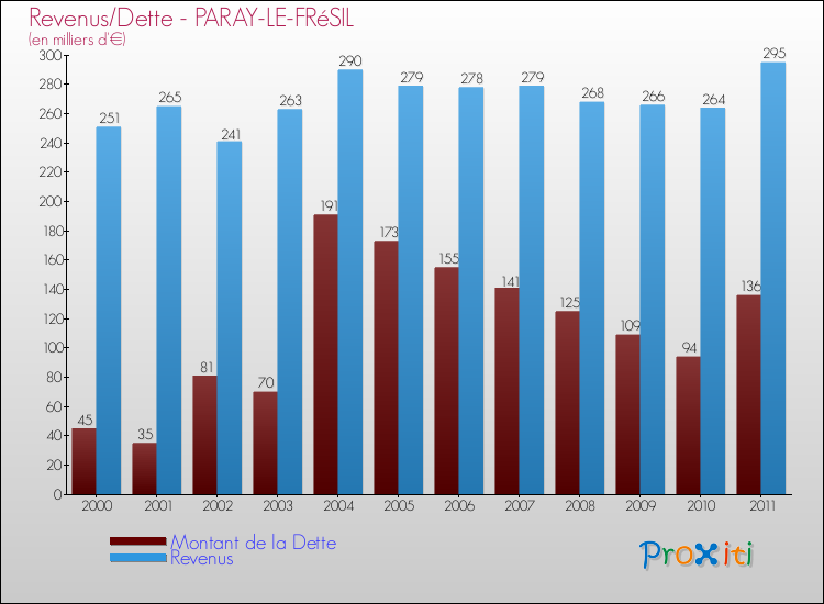 Comparaison Revenus/Dette de Paray-le-Frésil (de 2000 à 2011)