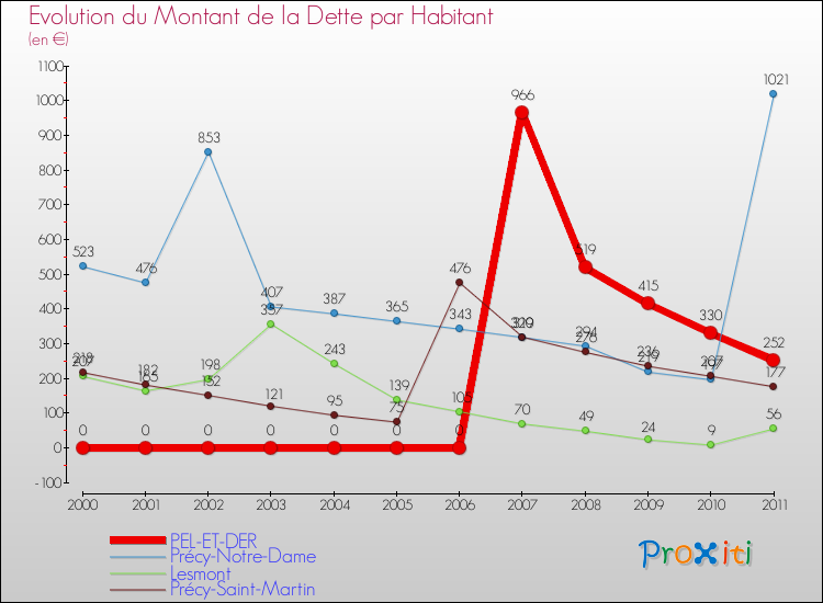 Par rapport aux 149 habitants de Pel-et-Der, en 2011 le poids de cette dette représente 252 € par habitant.