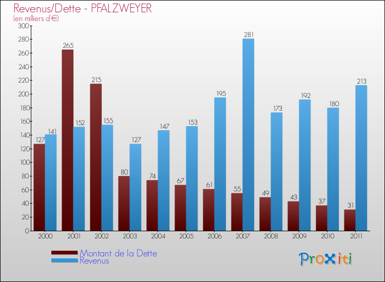 Comparaison Revenus/Dette de Pfalzweyer (de 2000 à 2011)