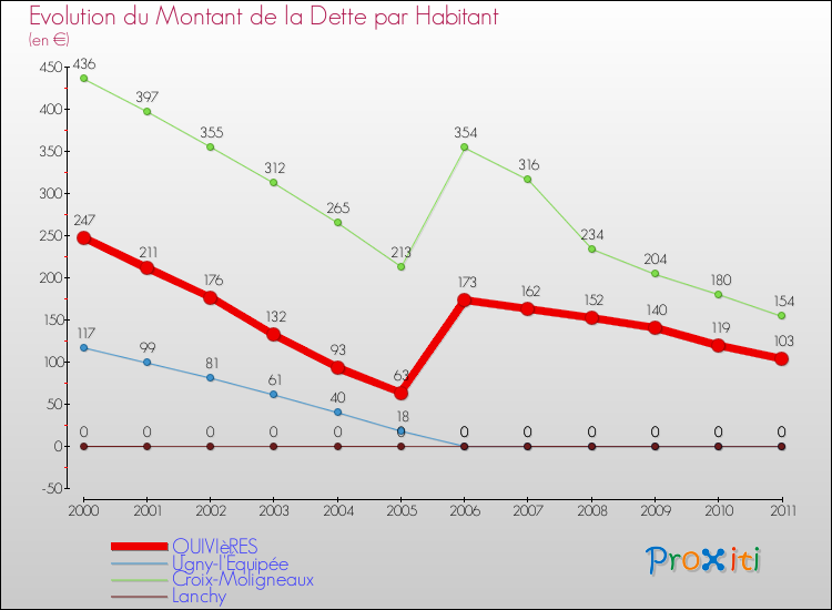 A Quivières, la dette par habitant a donc baissé de 58.3 % entre 2000 et 2011.