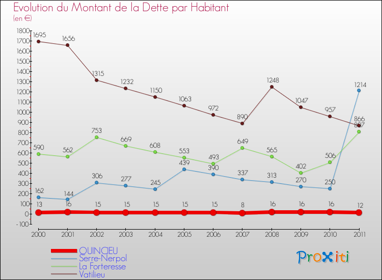 A Quincieu, la dette par habitant a donc baissé de 7.69 % entre 2000 et 2011.