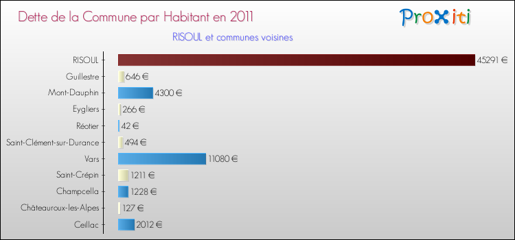 A Risoul, la dette due par habitant de la commune en 2011 est donc plus élevée de 6932.76 % que pour des communes similaires.