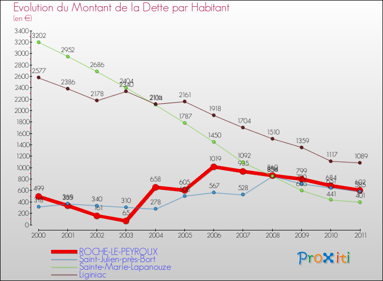A Roche-le-Peyroux, la dette par habitant a donc augmenté de 20.64 % entre 2000 et 2011.
