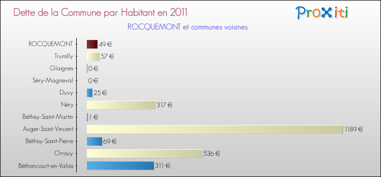 A noter : la valeur moyenne de la dette par habitant des communes françaises similaires à Rocquemont était de 505 € par habitant, en 2011.