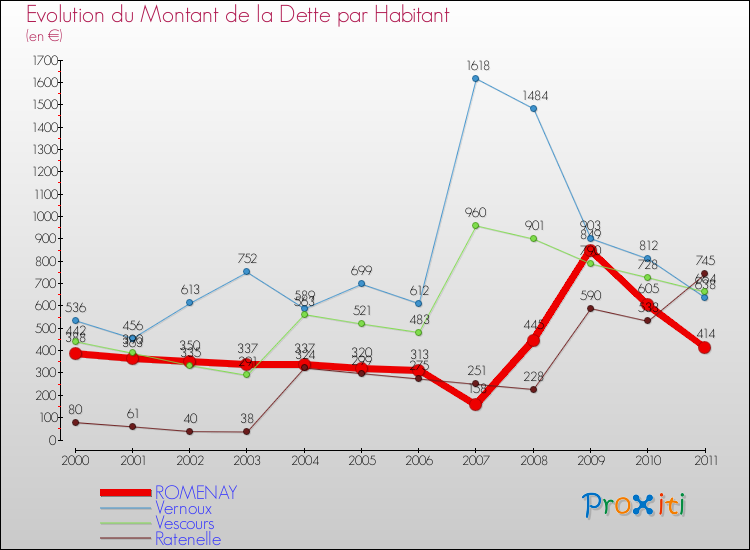 A noter : la valeur moyenne de la dette par habitant des communes françaises similaires à Romenay était de 644 € par habitant, en 2011.