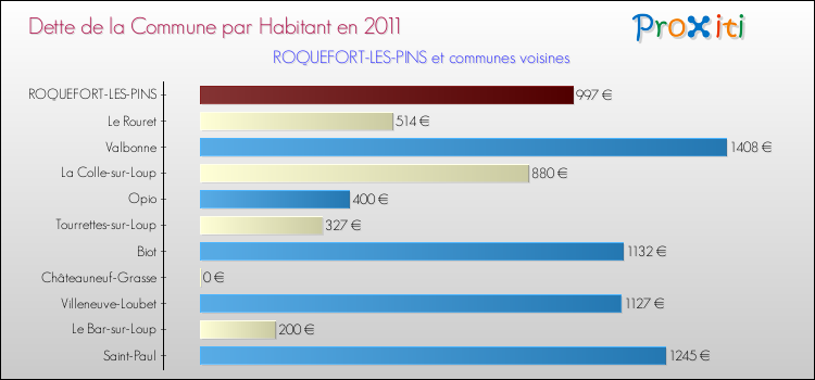 A Roquefort-les-Pins, la dette due par habitant de la commune en 2011 est donc plus élevée de 14.07 % que pour des communes similaires.