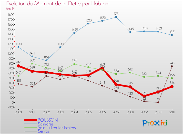 A Rousson, la dette par habitant a donc baissé de 56.63 % entre 2000 et 2011.