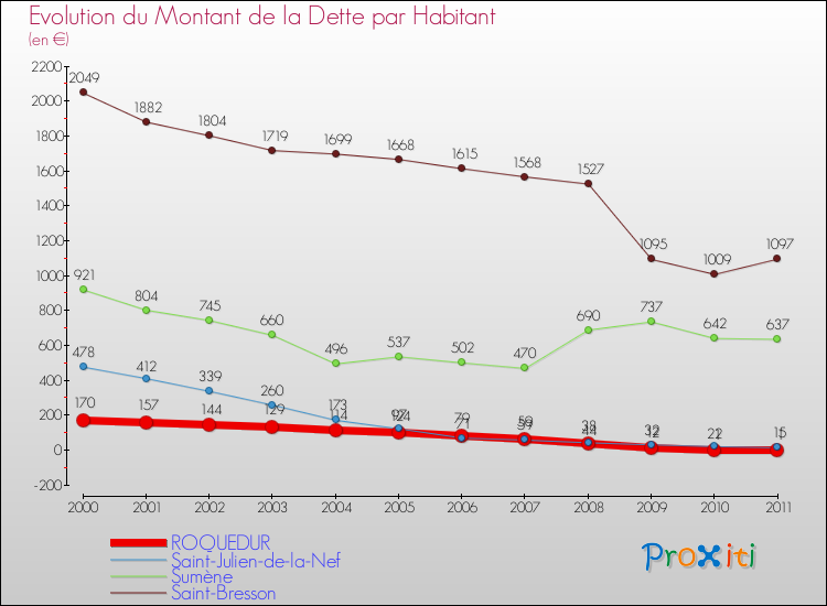A Roquedur, la dette par habitant a donc baissé de 99.41 % entre 2000 et 2011.