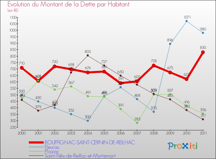 Par rapport aux 1 583 habitants de Rouffignac-Saint-Cernin-de-Reilhac, en 2011 le poids de cette dette représente 830 € par habitant.