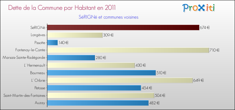 Par rapport aux 1 035 habitants de Sérigné, en 2011 le poids de cette dette représente 674 € par habitant.