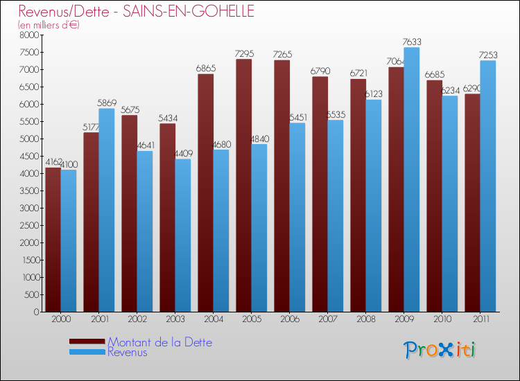 Comparaison Revenus/Dette de Sains-en-Gohelle (de 2000 à 2011)