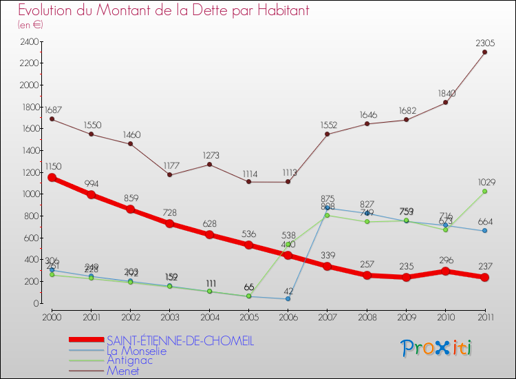 Pendant la même période, les communes françaises similaires à Saint-Étienne-de-Chomeil, ont vu leur dette par habitant augmenter de 14.58 % en moyenne entre 2000 et 2011.