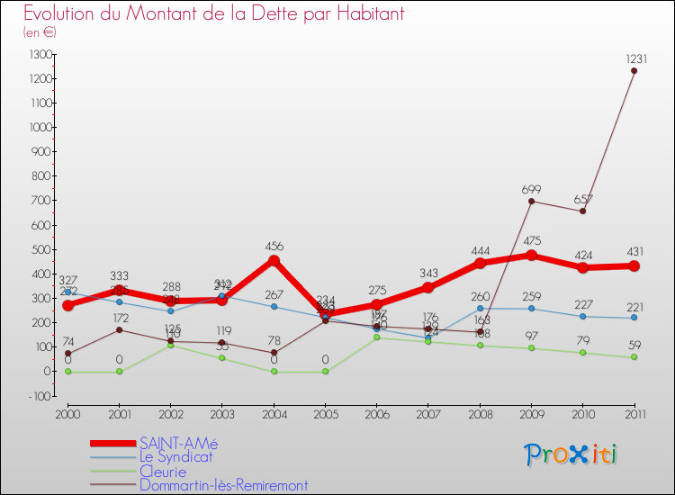 A Saint-Amé, ce montant de la dette est en augmentation de 2.81 % par rapport à 2010.