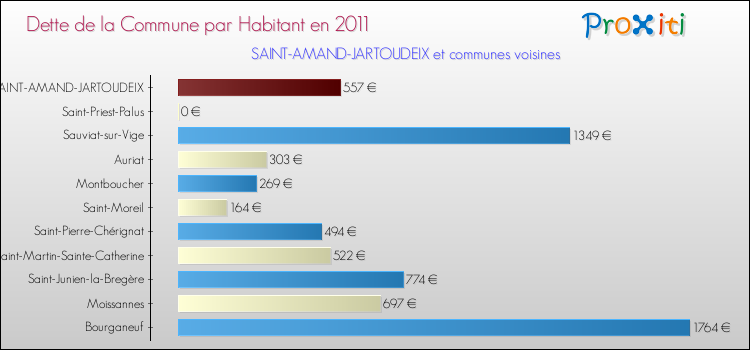 A Saint-Amand-Jartoudeix, la dette due par habitant de la commune en 2011 est donc plus élevée de 10.74 % que pour des communes similaires.