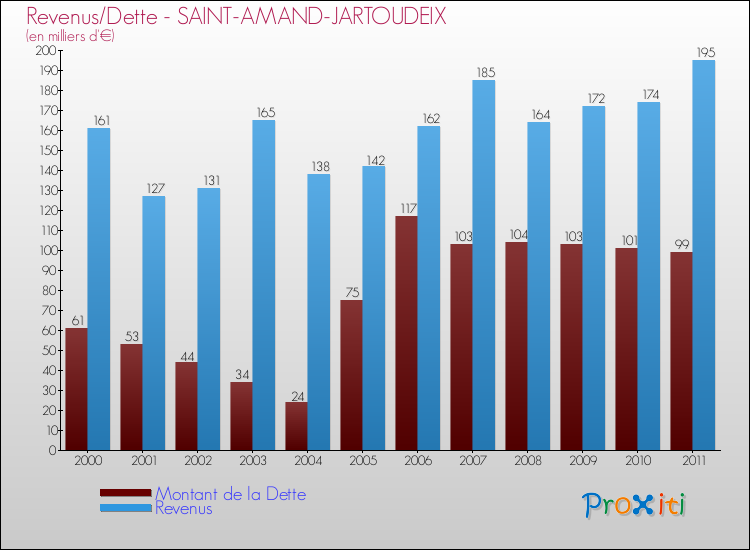 Comparaison Revenus/Dette de Saint-Amand-Jartoudeix (de 2000 à 2011)