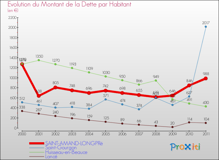 Par rapport aux 1 217 habitants de Saint-Amand-Longpré, en 2011 le poids de cette dette représente 988 € par habitant.