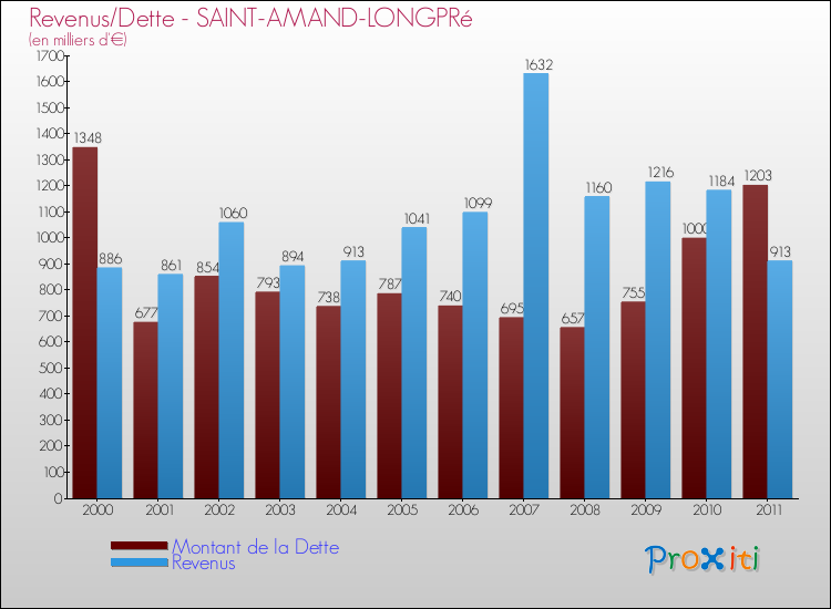 Comparaison Revenus/Dette de Saint-Amand-Longpré (de 2000 à 2011)