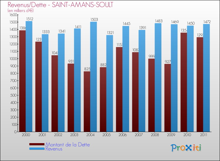 Comparaison Revenus/Dette de Saint-Amans-Soult (de 2000 à 2011)