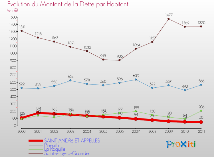 Par rapport aux 693 habitants de Saint-André-et-Appelles, en 2011 le poids de cette dette représente 50 € par habitant.