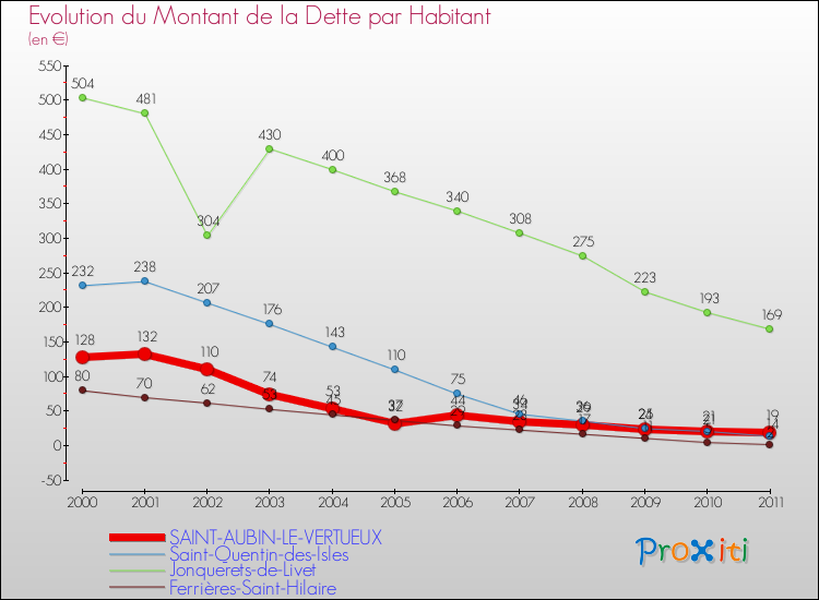 A Saint-Aubin-le-Vertueux, la dette par habitant a donc baissé de 85.16 % entre 2000 et 2011.