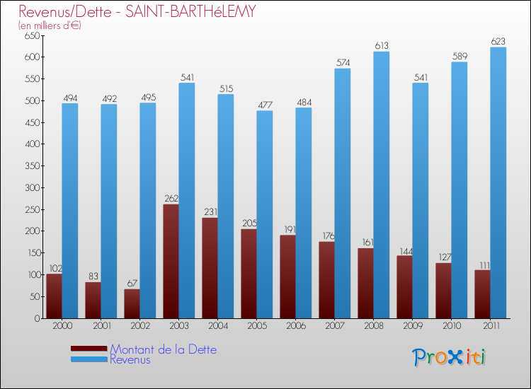 En 2011, le montant total des dettes dûes par la commune de Saint-Barthélemy était de : 111 000 €.