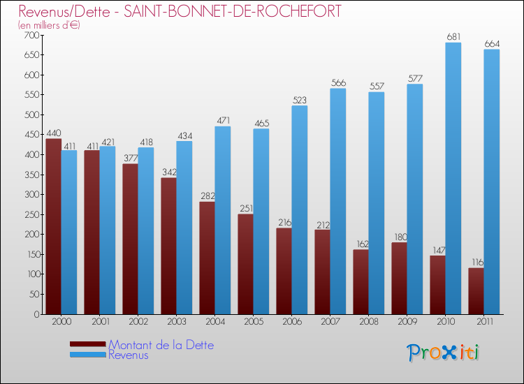 Comparaison Revenus/Dette de Saint-Bonnet-de-Rochefort (de 2000 à 2011)