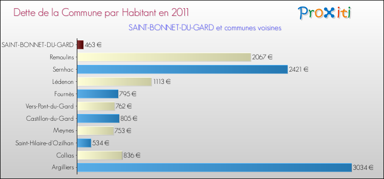 A Saint-Bonnet-du-Gard, la dette par habitant a donc augmenté de 71.48 % entre 2000 et 2011.