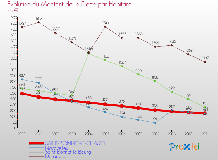A Saint-Bonnet-le-Chastel, la dette par habitant a donc baissé de 57.82 % entre 2000 et 2011.