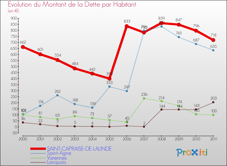 A Saint-Capraise-de-Lalinde, la dette par habitant a donc augmenté de 8.46 % entre 2000 et 2011.