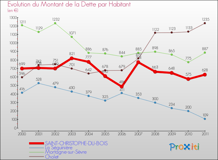 A noter : la valeur moyenne de la dette par habitant des communes françaises similaires à Saint-Christophe-du-Bois était de 706 € par habitant, en 2011.