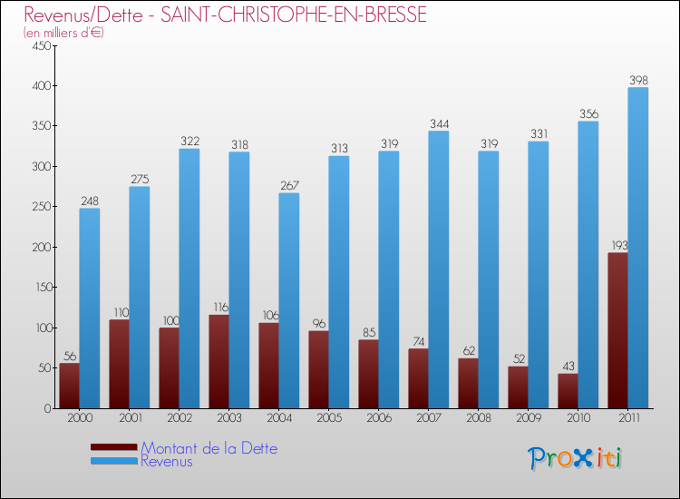 Comparaison Revenus/Dette de Saint-Christophe-en-Bresse (de 2000 à 2011)