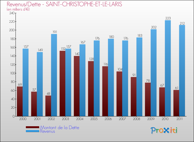 Comparaison Revenus/Dette de Saint-Christophe-et-le-Laris (de 2000 à 2011)