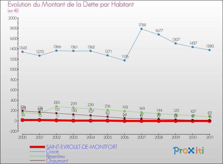 A Saint-Evroult-de-Montfort, la dette par habitant a donc baissé de 100 % entre 2000 et 2011.
