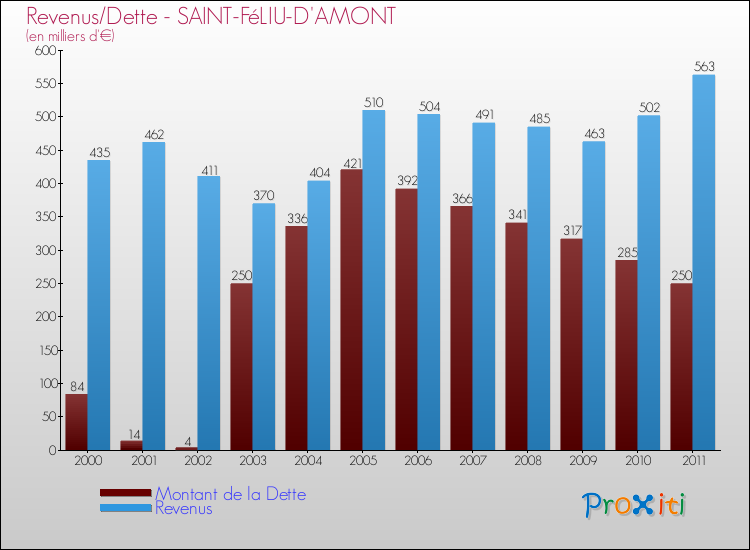 Comparaison Revenus/Dette de Saint-Féliu-d'Amont (de 2000 à 2011)