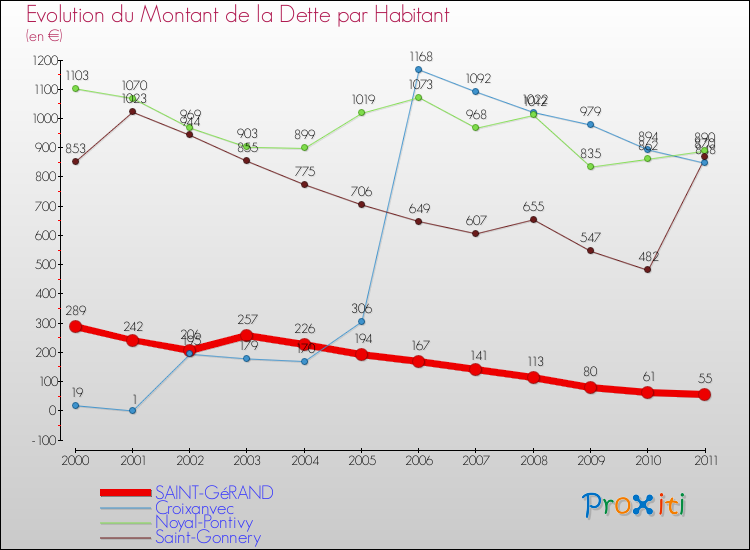 A Saint-Gérand, la dette par habitant a donc baissé de 80.97 % entre 2000 et 2011.