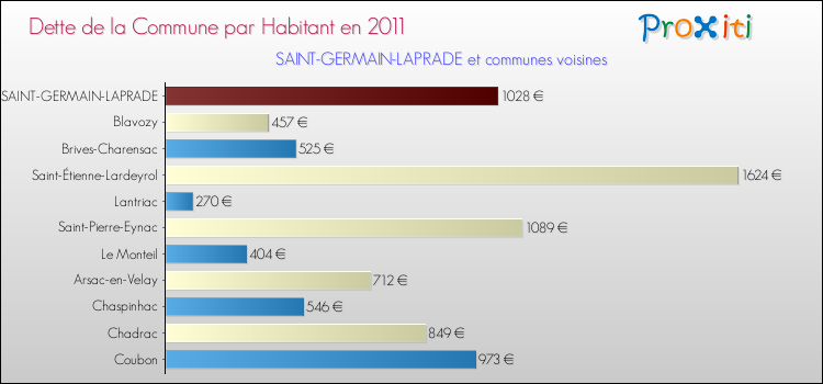 A Saint-Germain-Laprade, la dette due par habitant de la commune en 2011 est donc plus élevée de 45.61 % que pour des communes similaires.
