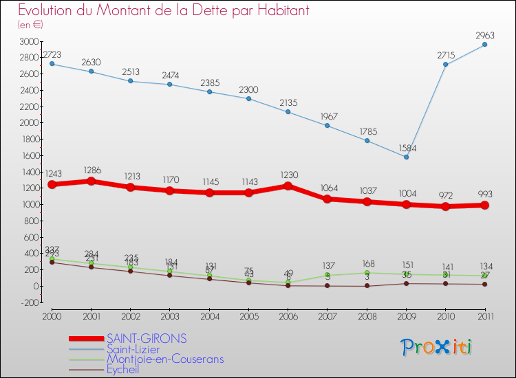 A Saint-Girons, la dette par habitant a donc baissé de 20.11 % entre 2000 et 2011.